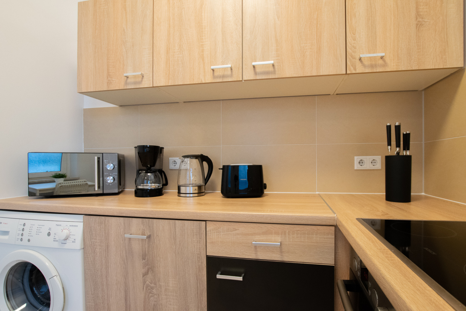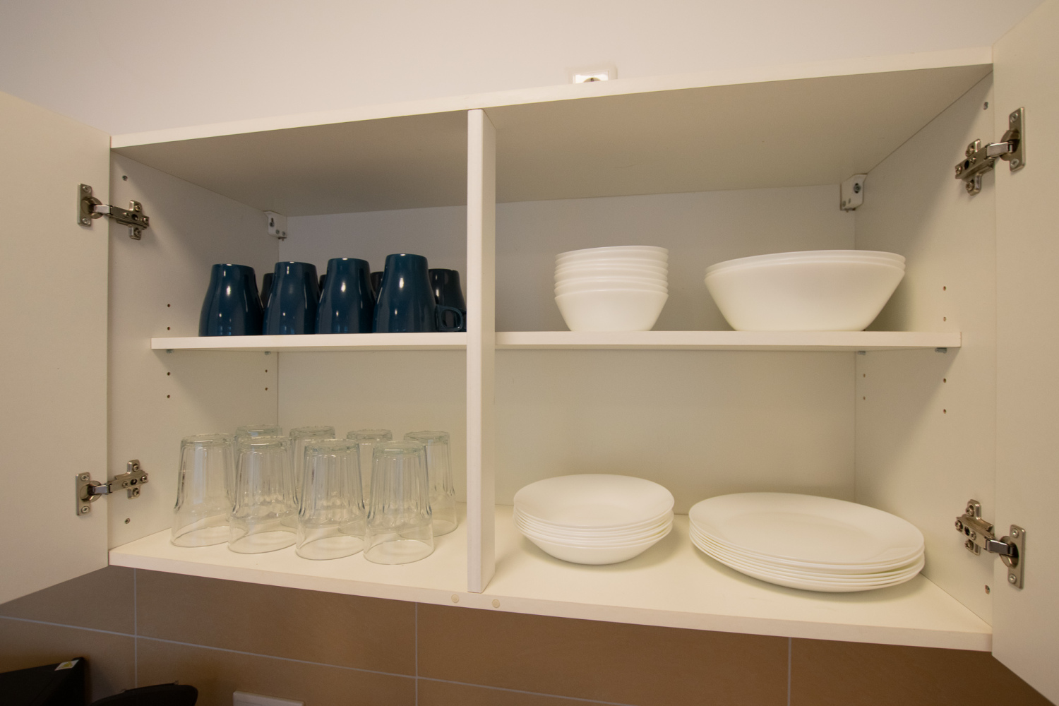 Küche : Kühl-Gefrierkombinationen , Spülmaschine , Backofen , Mikrowelle , Kaffeemaschine , Wasserkocher , Töpfe , Pfannen , Messerset , Geschirr , Gläser , Tassen , Besteck , diverse Kochutensilien , Backpapier , Gewürze , Kaffee , Kaffeefilter , Öl , Zucker und Süßstoff