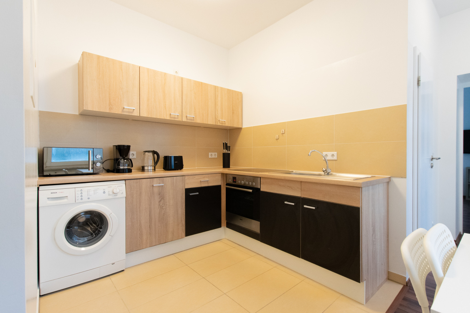 Küche: Kühl-Gefrierkombinationen , Backofen , Mikrowelle , Kaffeemaschine , Wasserkocher , Töpfe , Pfannen , Messerset , Geschirr , Gläser , Tassen , Besteck , diverse Kochutensilien , Backpapier , Gewürze , Kaffee , Kaffeefilter , Öl , Zucker und Süßstoff