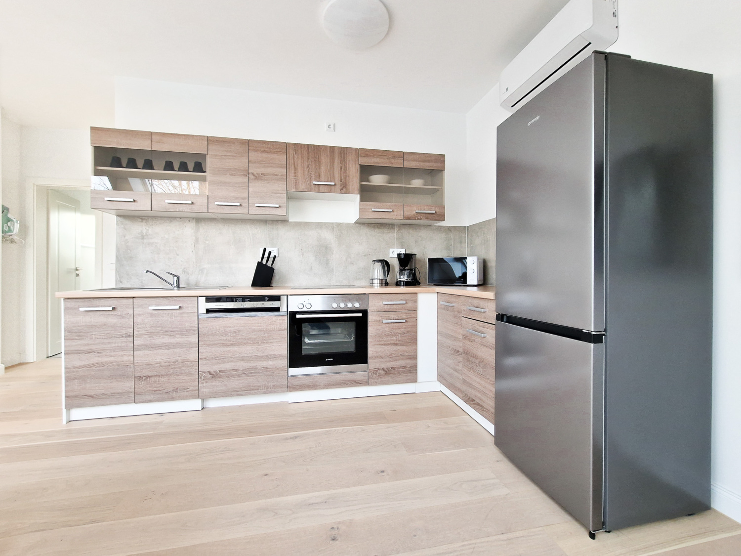 Küche: Kühl-Gefrierkombinationen , Spülmaschine , Backofen , Mikrowelle , Kaffeemaschine , Wasserkocher , Töpfe , Pfannen , Messerset , Geschirr , Gläser , Tassen , Besteck , diverse Kochutensilien , Backpapier , Gewürze , Kaffee , Kaffeefilter , Öl , Zucker und Süßstoff