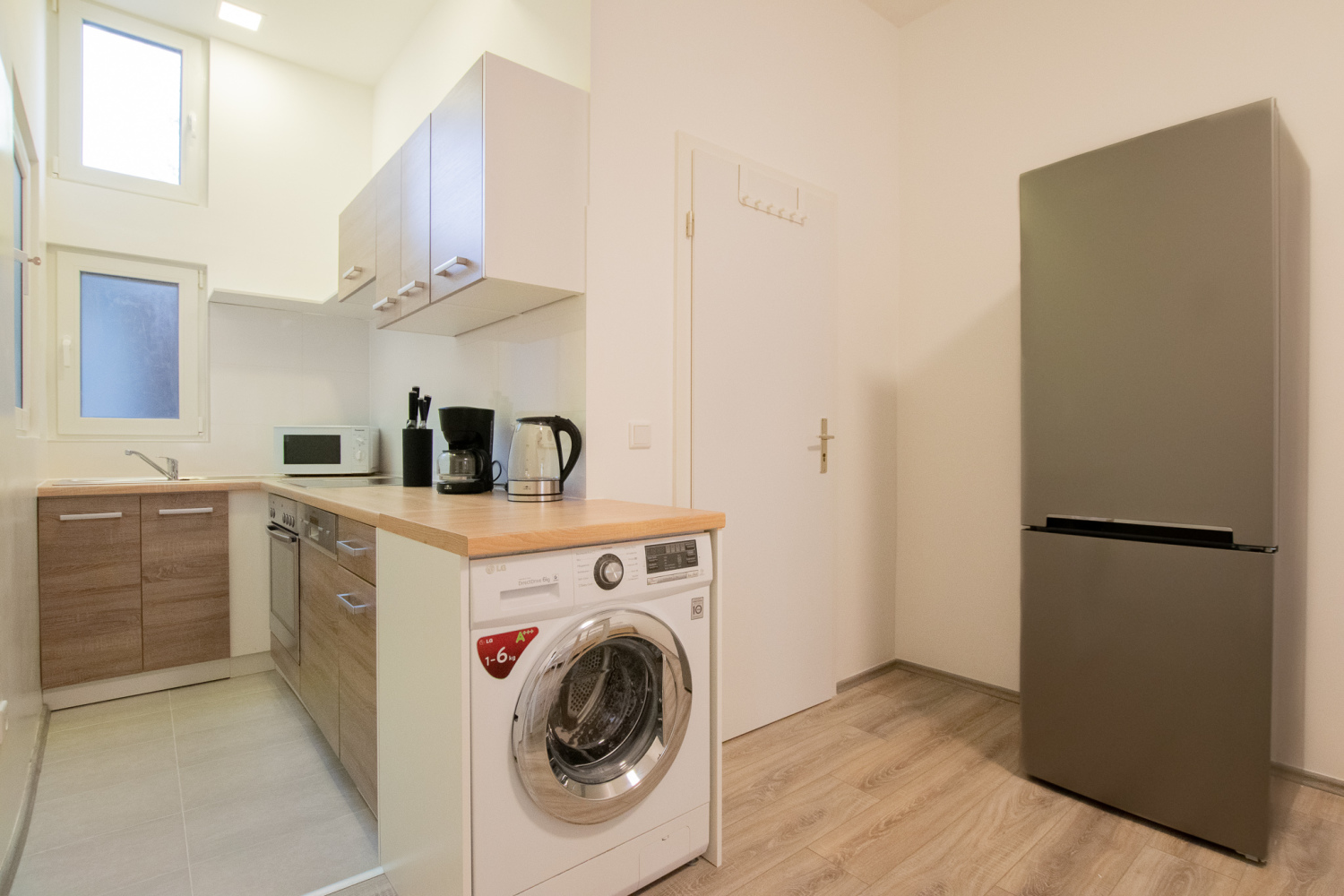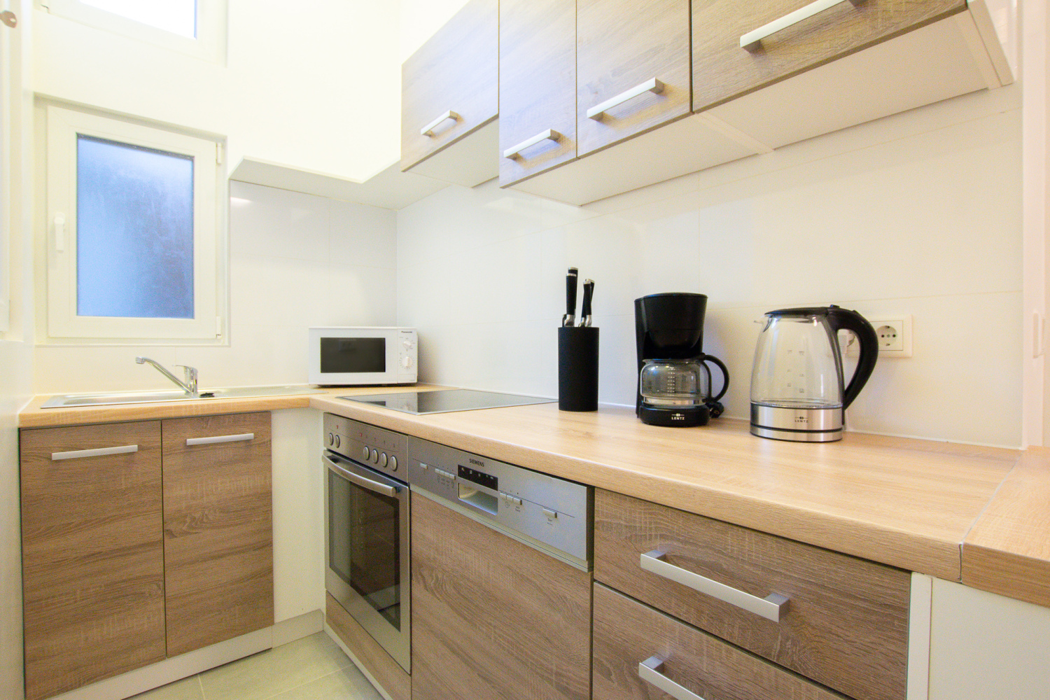 Küche: Kühl-Gefrierkombinationen , Spülmaschine , Backofen , Mikrowelle , Kaffeemaschine , Toaster , Wasserkocher , Töpfe , Pfannen , Messerset , Geschirr , Gläser , Tassen , Besteck , diverse Kochutensilien , Backpapier , Gewürze , Kaffee , Kaffeefilter , Öl , Zucker und Süßstoff