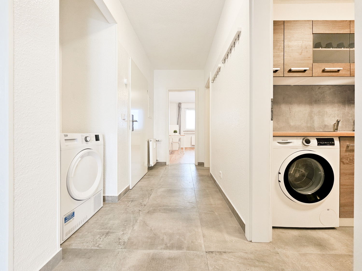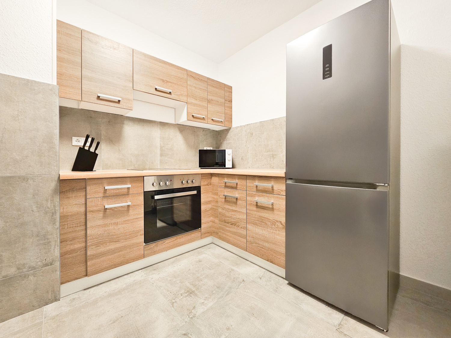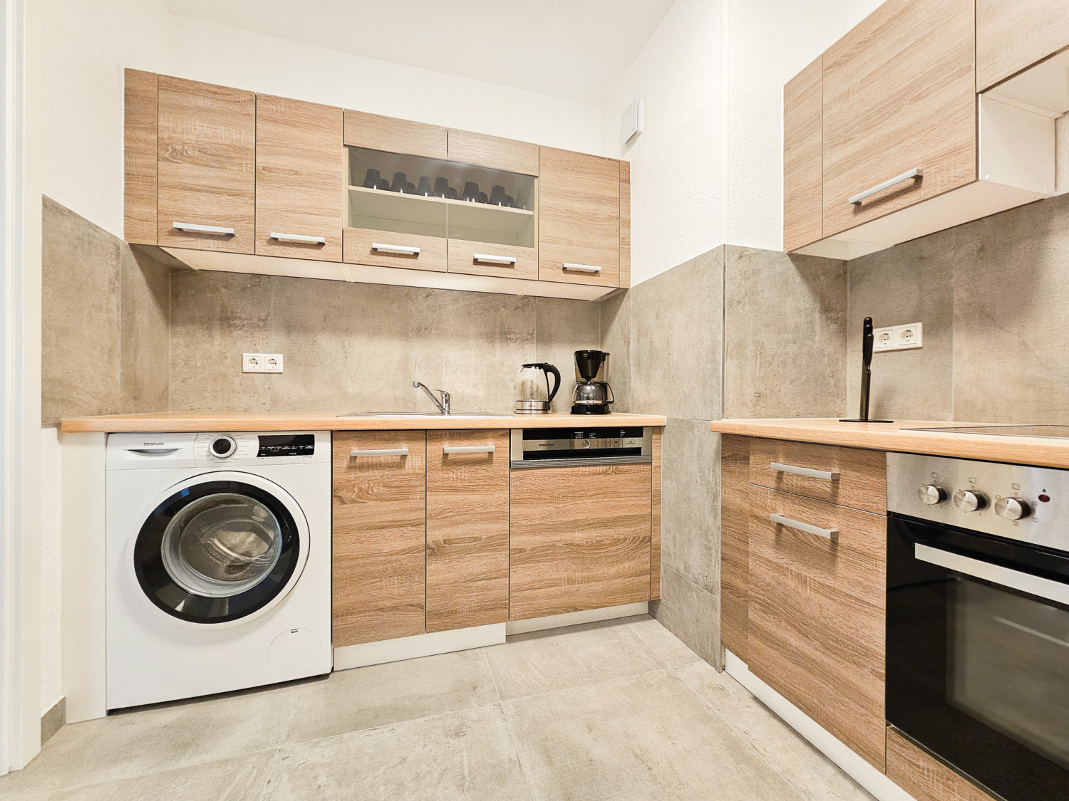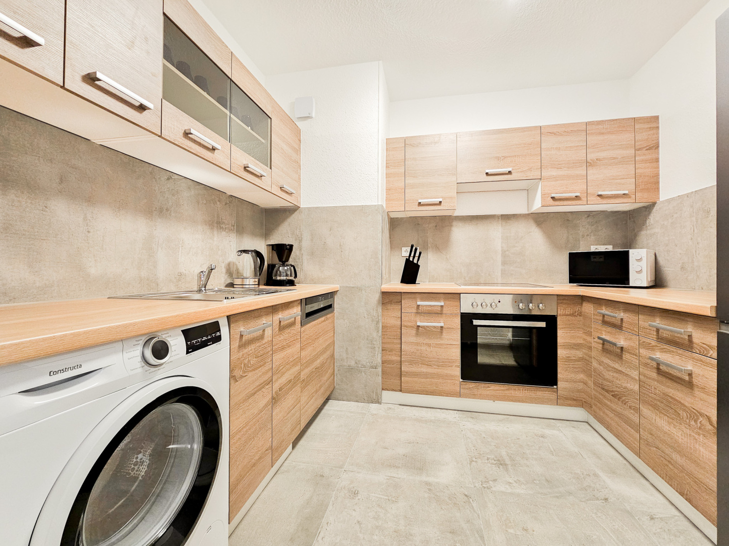 Küche: Kühl-Gefrierkombinationen , Spülmaschine , Backofen , Mikrowelle , Kaffeemaschine , Wasserkocher , Töpfe , Pfannen , Messerset , Geschirr , Gläser , Tassen , Besteck , diverse Kochutensilien , Backpapier , Gewürze , Kaffee , Kaffeefilter , Öl , Zucker und Süßstoff