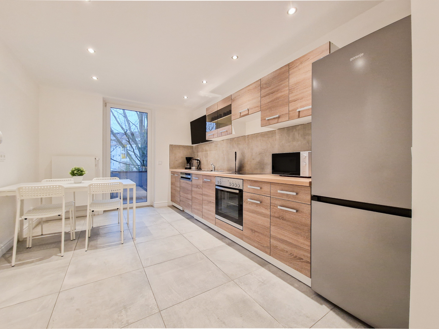 Küche: Kühl-Gefrierkombinationen , Spülmaschine , Backofen , Mikrowelle , Kaffeemaschine , Wasserkocher , Töpfe , Pfannen , Messerset , Geschirr , Gläser , Tassen , Besteck , diverse Kochutensilien , Backpapier , Gewürze , Kaffee , Kaffeefilter , Öl , Zucker und Süßstoff