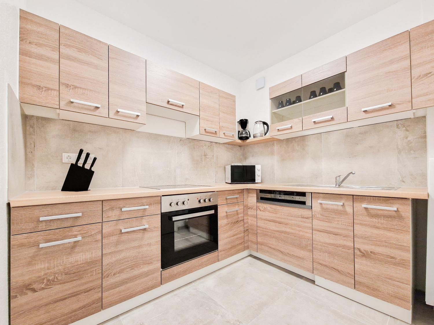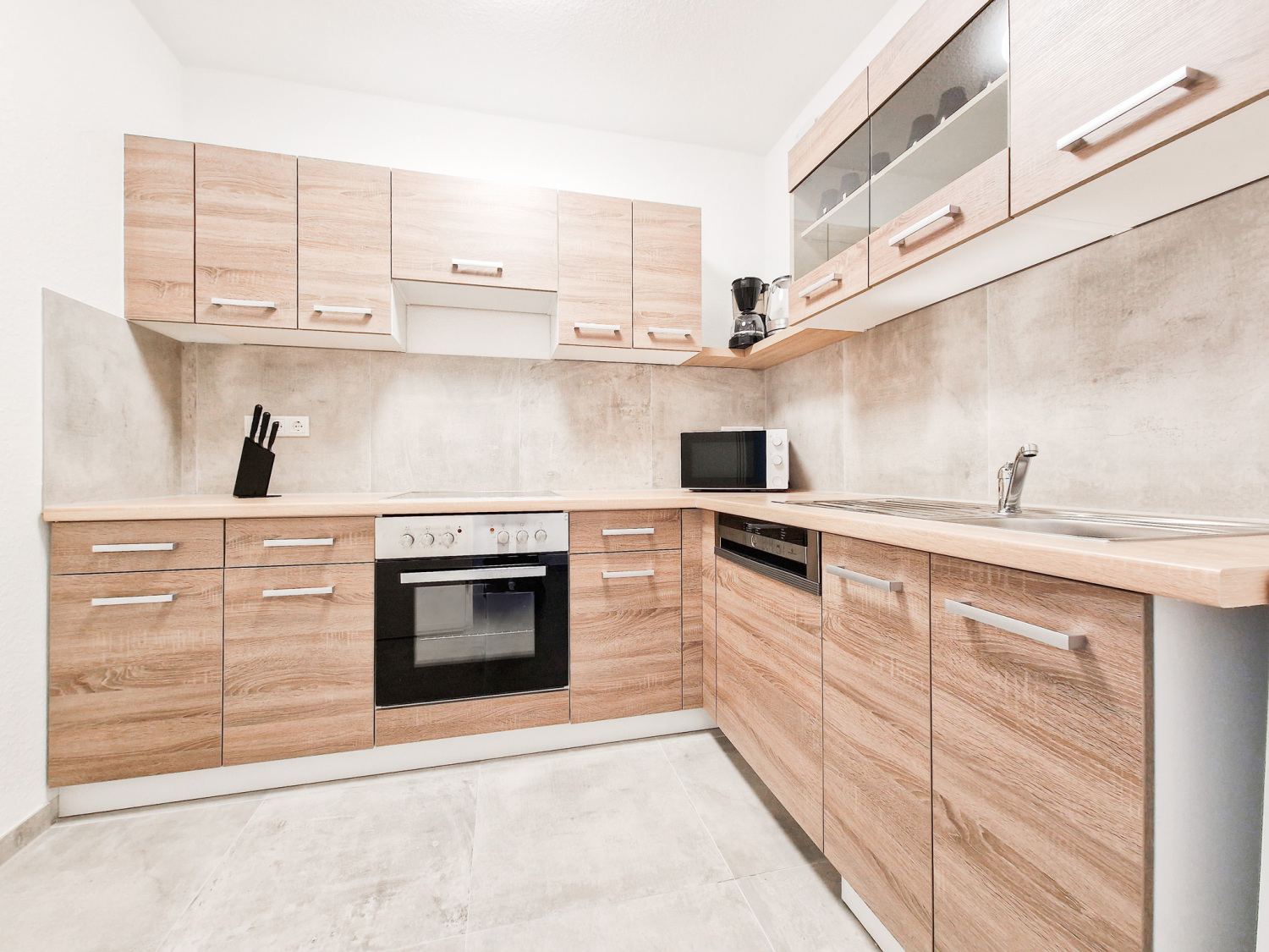 Küche: Kühl-Gefrierkombinationen , Backofen , Mikrowelle , Kaffeemaschine , Wasserkocher , Töpfe , Pfannen , Messerset , Geschirr , Gläser , Tassen , Besteck , diverse Kochutensilien , Backpapier , Gewürze , Kaffee , Kaffeefilter , Öl , Zucker und Süßstoff