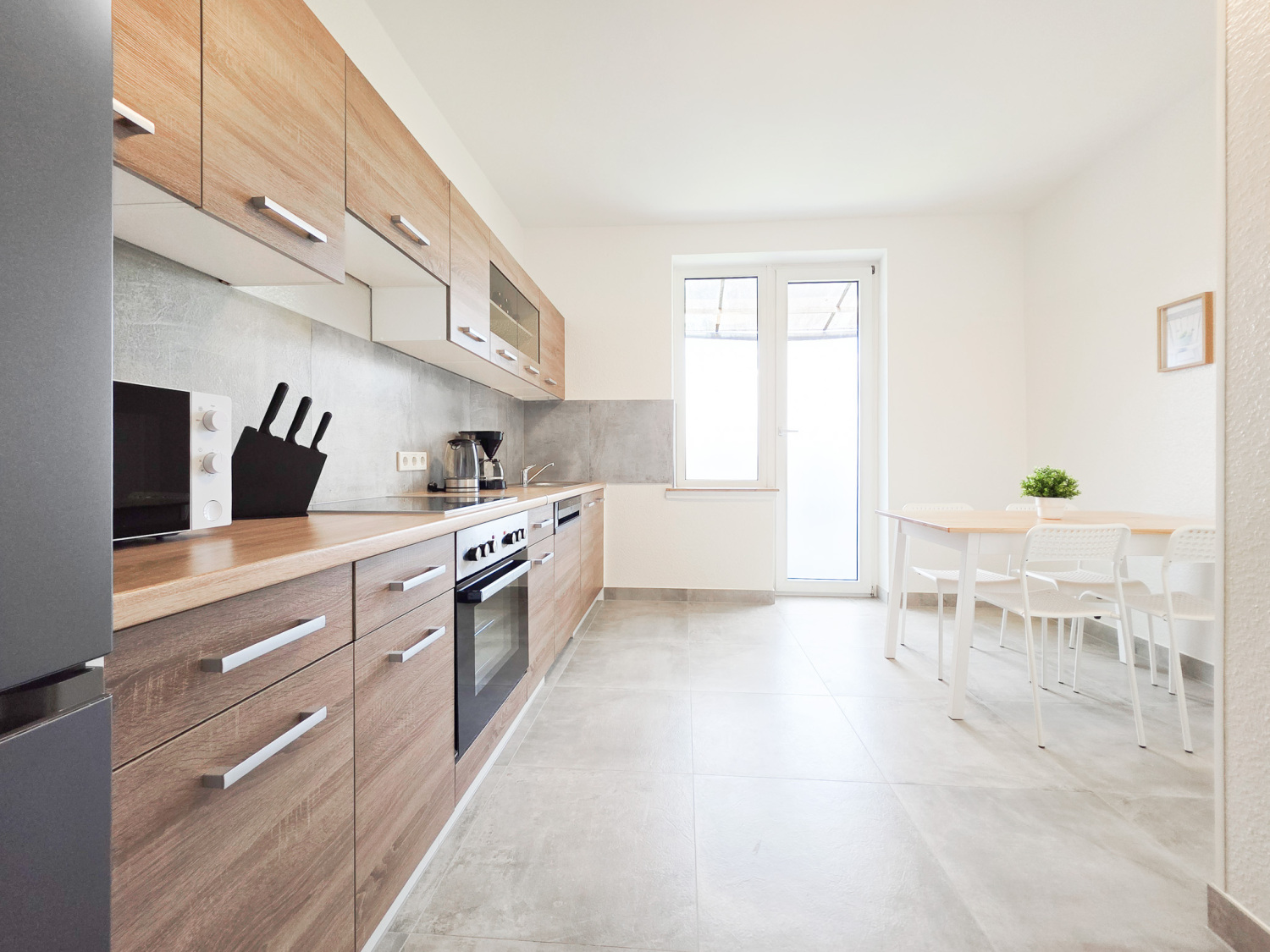 Küche: Kühl-Gefrierkombinationen , Backofen , Mikrowelle , Kaffeemaschine , Wasserkocher , Töpfe , Pfannen , Messerset , Geschirr , Gläser , Tassen , Besteck , diverse Kochutensilien , Backpapier , Gewürze , Kaffee , Kaffeefilter , Öl , Zucker und Süßstoff