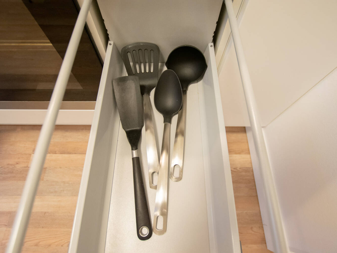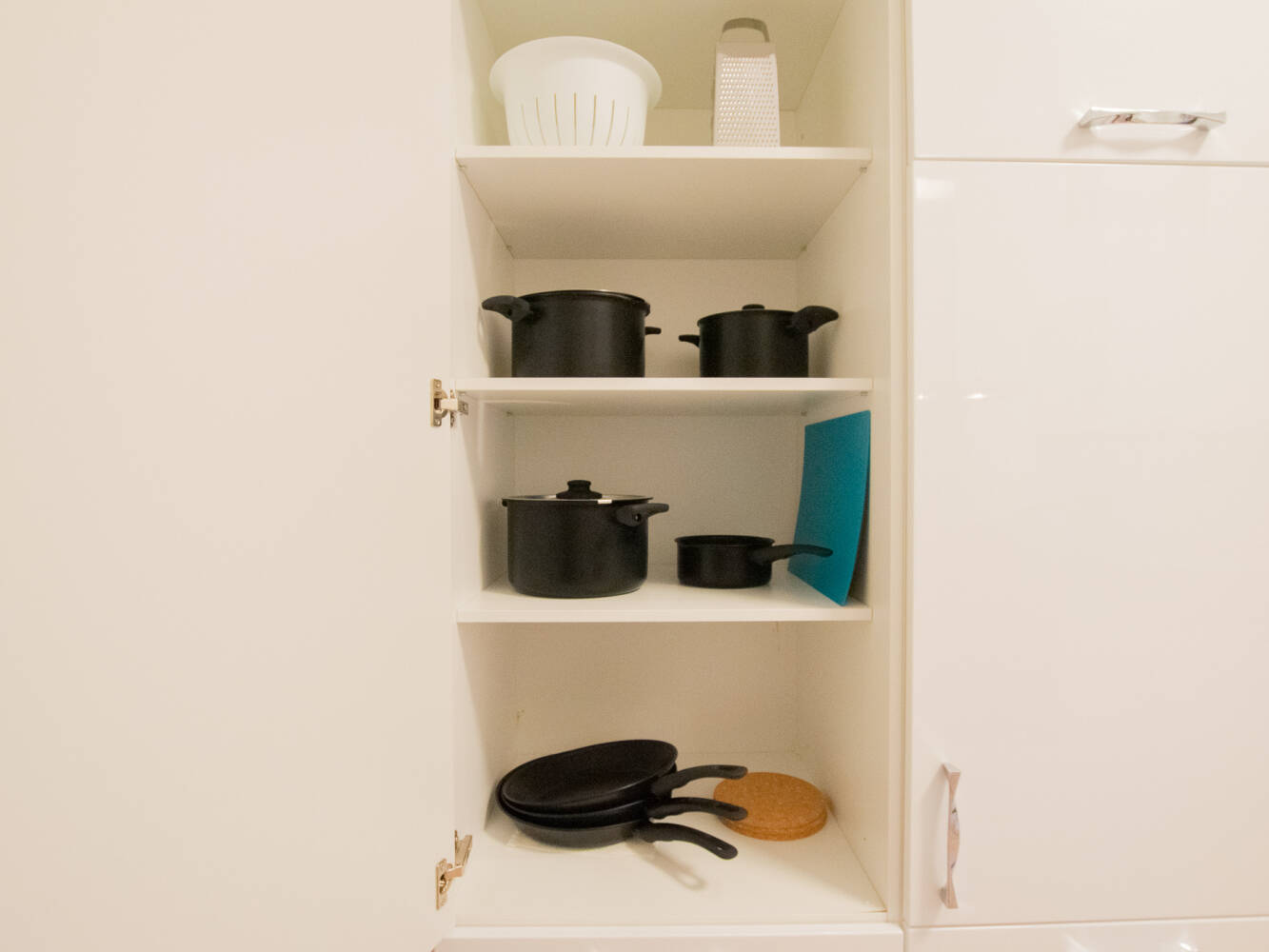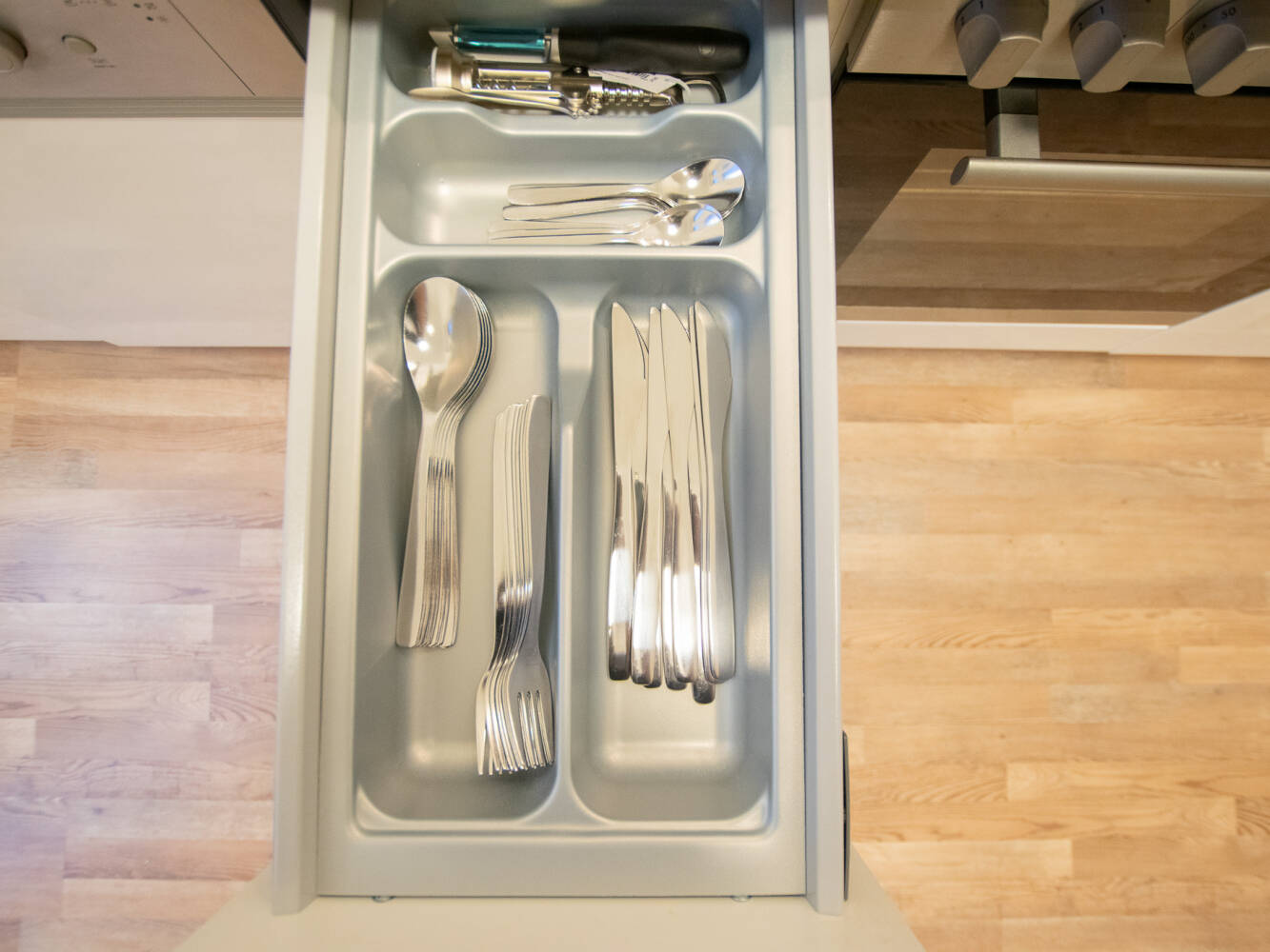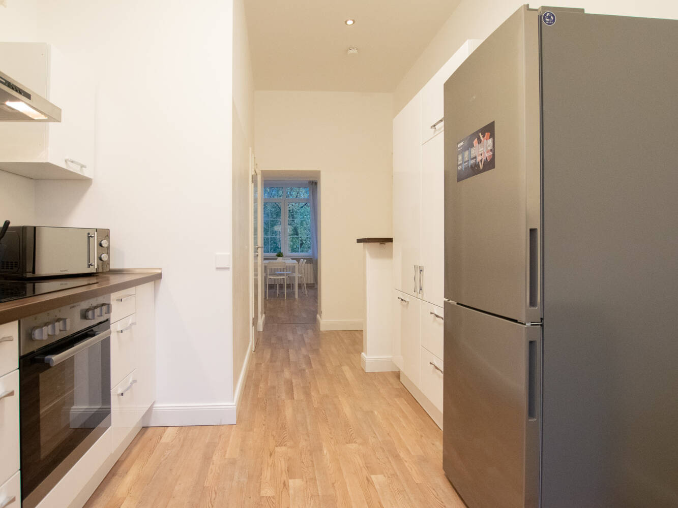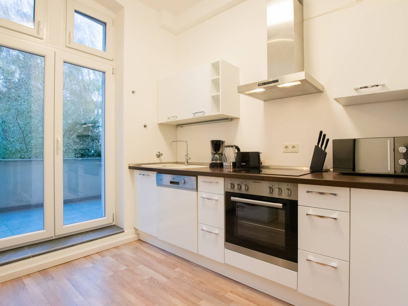 Küche : Kühl-Gefrierkombinationen , Spülmaschine , Backofen , Mikrowelle , Kaffeemaschine , Wasserkocher , Töpfe , Pfannen , Messerset , Geschirr , Gläser , Tassen , Besteck , diverse Kochutensilien , Backpapier , Gewürze , Kaffee , Kaffeefilter , Öl , Zucker und Süßstoff