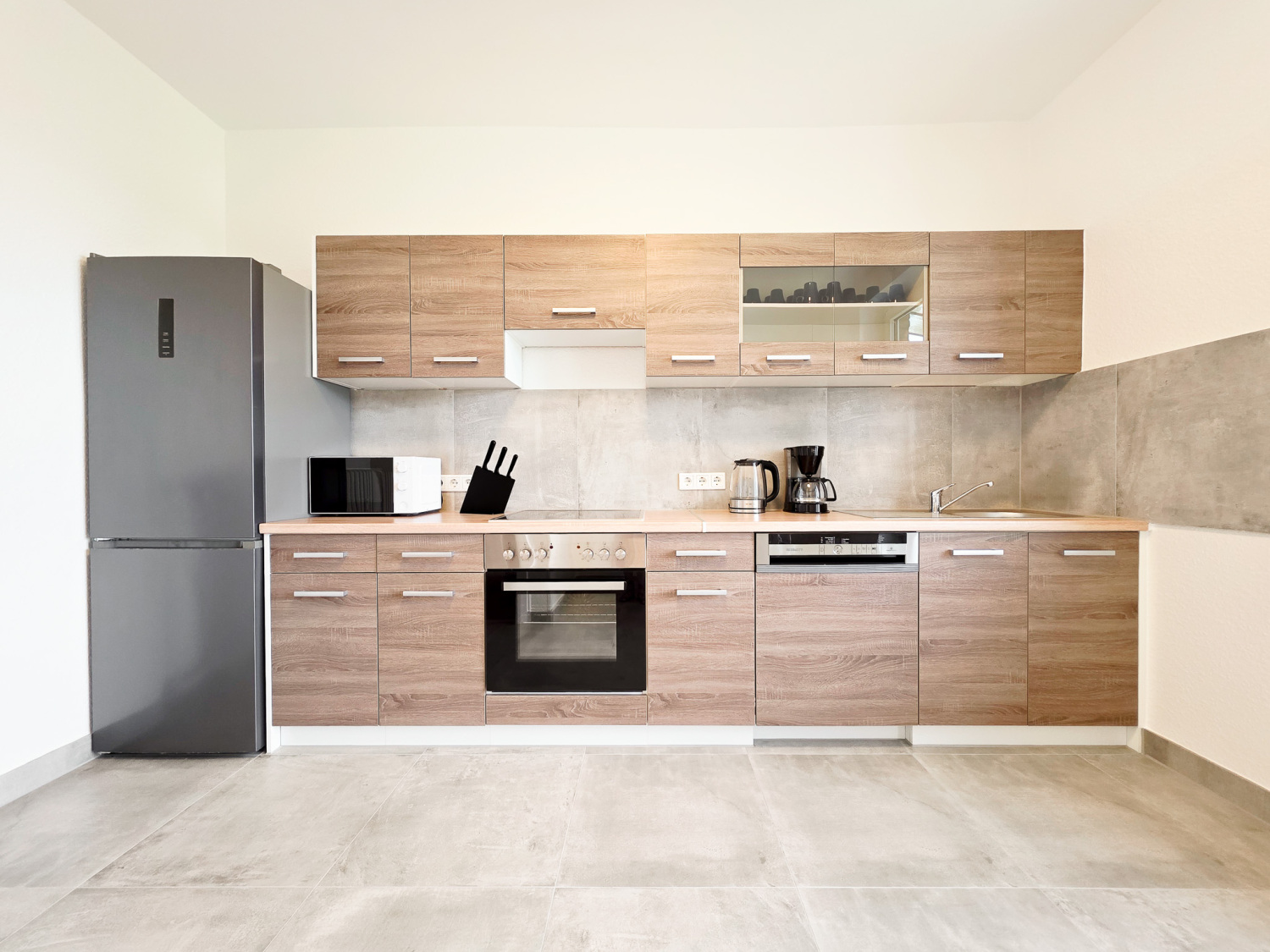 Küche: Kühl-Gefrierkombinationen , Backofen , Mikrowelle , Kaffeemaschine , Wasserkocher , Töpfe , Pfannen , Messerset , Geschirr , Gläser , Tassen , Besteck , diverse Kochutensilien , Backpapier , Gewürze , Kaffee , Kaffeefilter , Öl , Zucker und Süßstoff