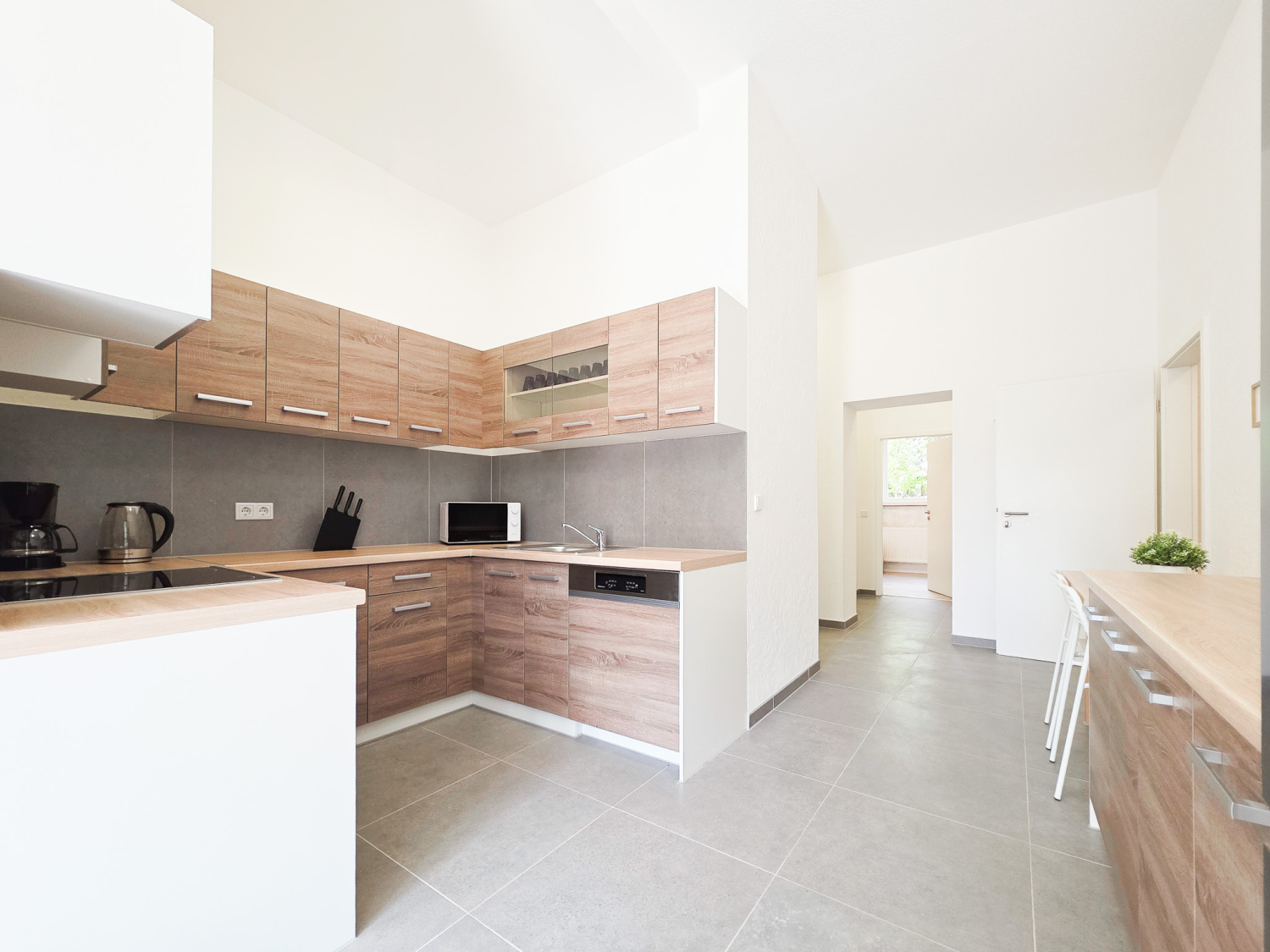 Küche: Kühl-Gefrierkombinationen , Spülmaschine , Backofen , Mikrowelle , Kaffeemaschine , Wasserkocher , Töpfe , Pfannen , Messerset , Geschirr , Gläser , Tassen , Besteck , diverse Kochutensilien , Backpapier , Gewürze , Kaffee , Kaffeefilter , Öl , Zucker und Süßstoff