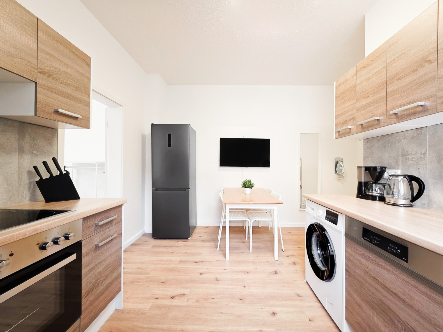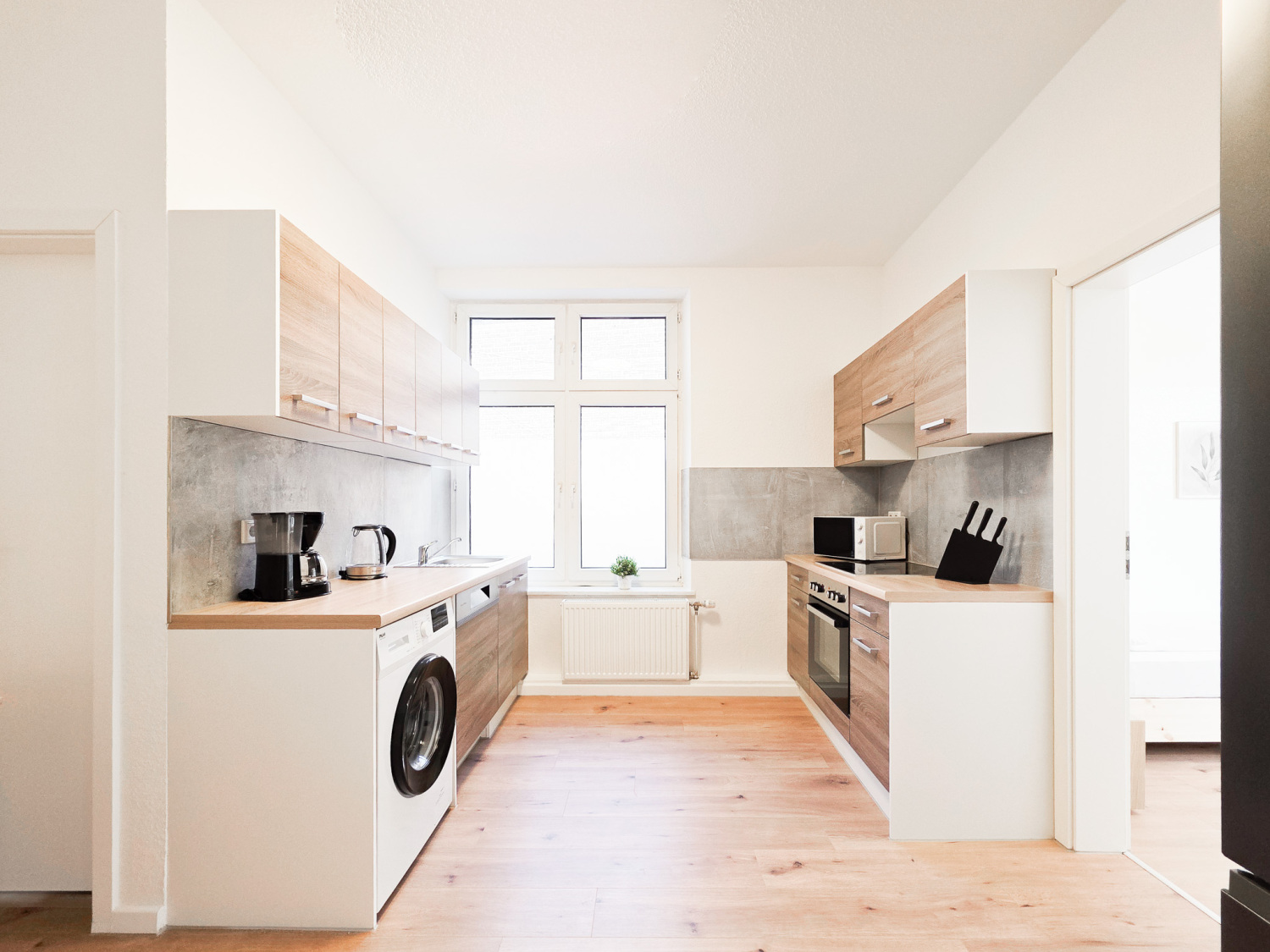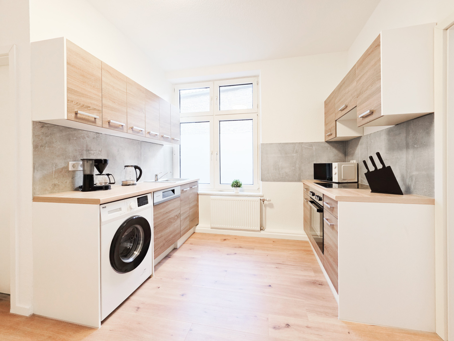 Küche: Kühl-Gefrierkombinationen , Spülmaschine , Backofen , Mikrowelle , Kaffeemaschine , Wasserkocher , Töpfe , Pfannen , Messerset , Geschirr , Gläser , Tassen , Besteck , diverse Kochutensilien , Backpapier , Gewürze , Kaffee , Kaffeefilter , Öl , Zucker und Süßstoff