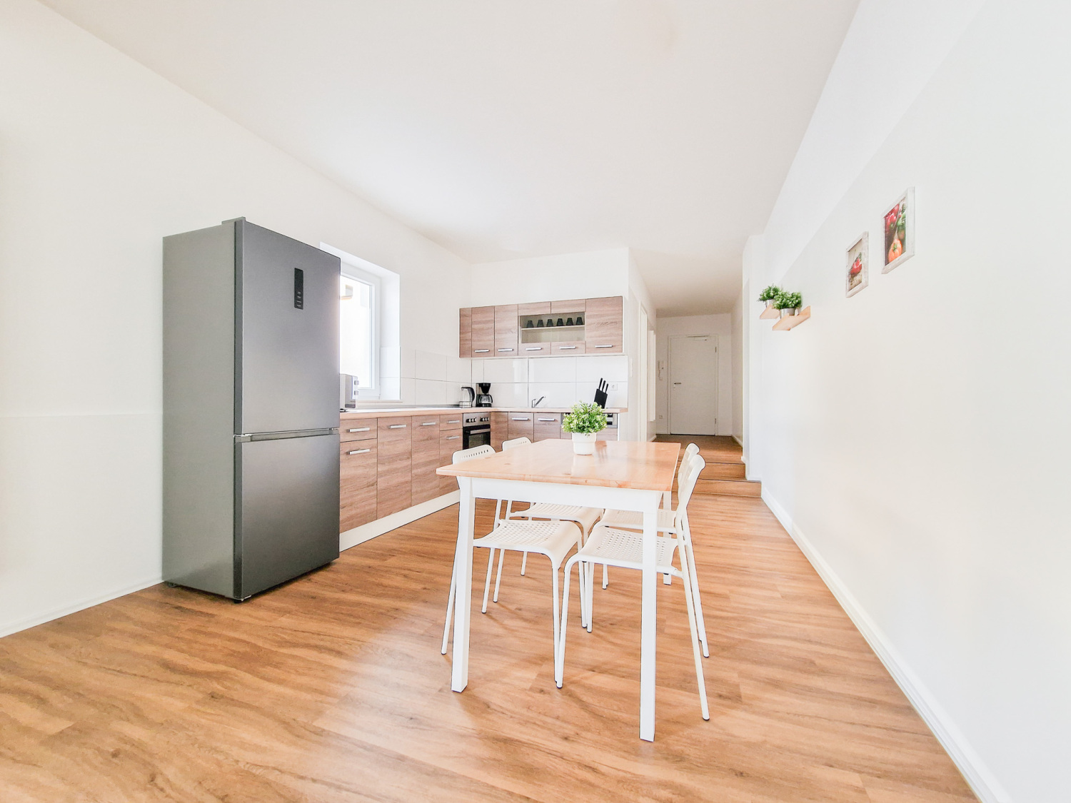 Küche: Kühl-Gefrierkombinationen , Backofen , Mikrowelle , Kaffeemaschine , Wasserkocher , Töpfe , Pfannen , Messerset , Geschirr , Gläser , Tassen , Besteck , diverse Kochutensilien , Backpapier , Gewürze , Kaffee , Kaffeefilter , Öl , Zucker und Süßstoff