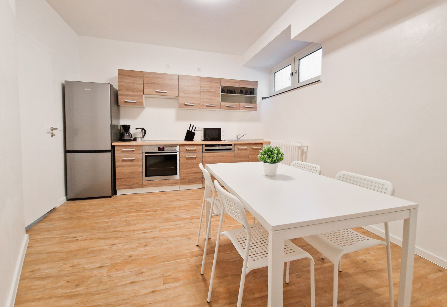 Küche: Kühl-Gefrierkombinationen , Spülmaschine , Backofen , Mikrowelle , Kaffeemaschine , Wasserkocher , Töpfe , Pfannen , Messerset , Geschirr , Gläser , Tassen , Besteck , diverse Kochutensilien , Backpapier , Gewürze , Kaffee , Kaffeefilter , Öl , Zucker und Süßstoff