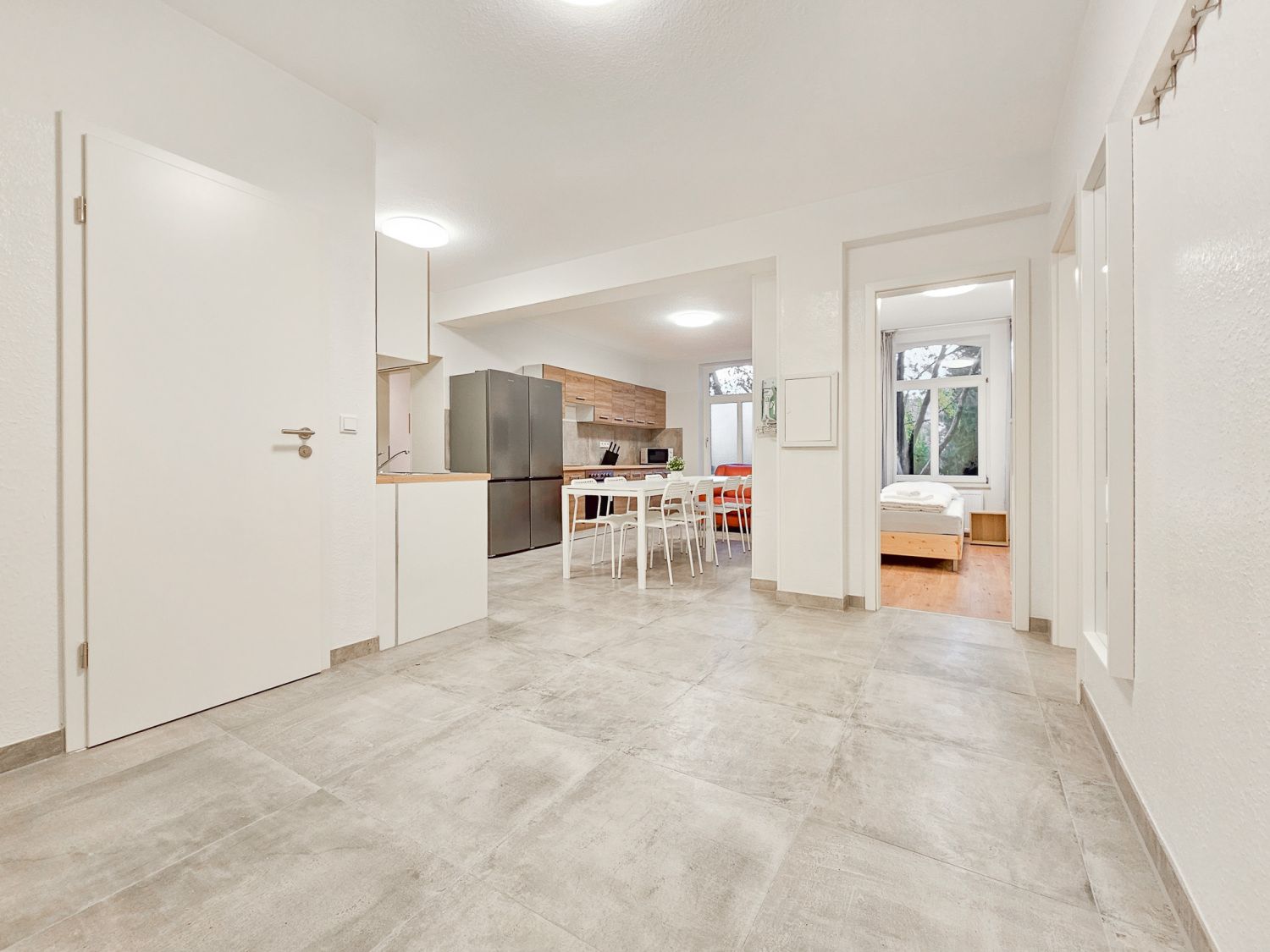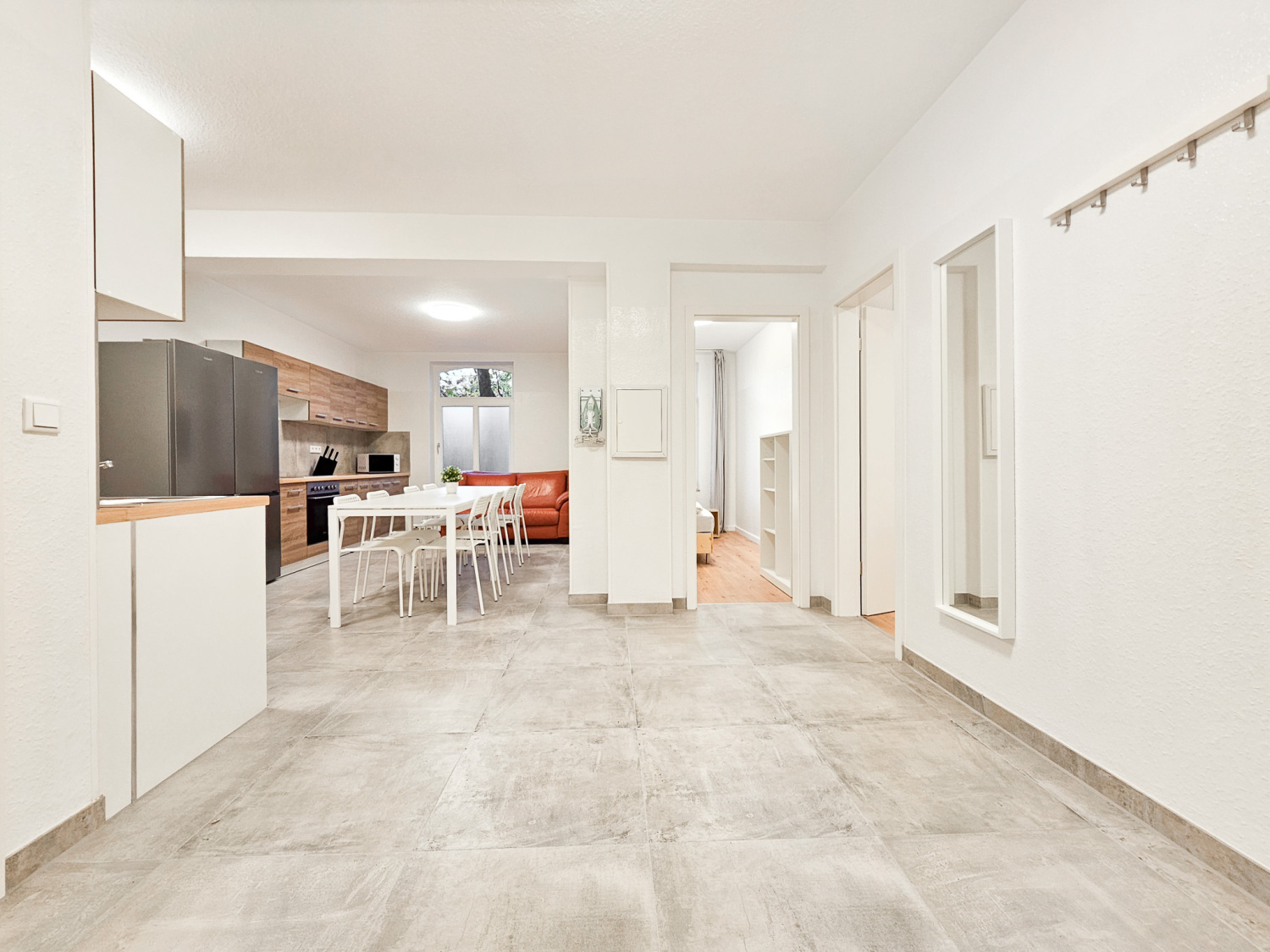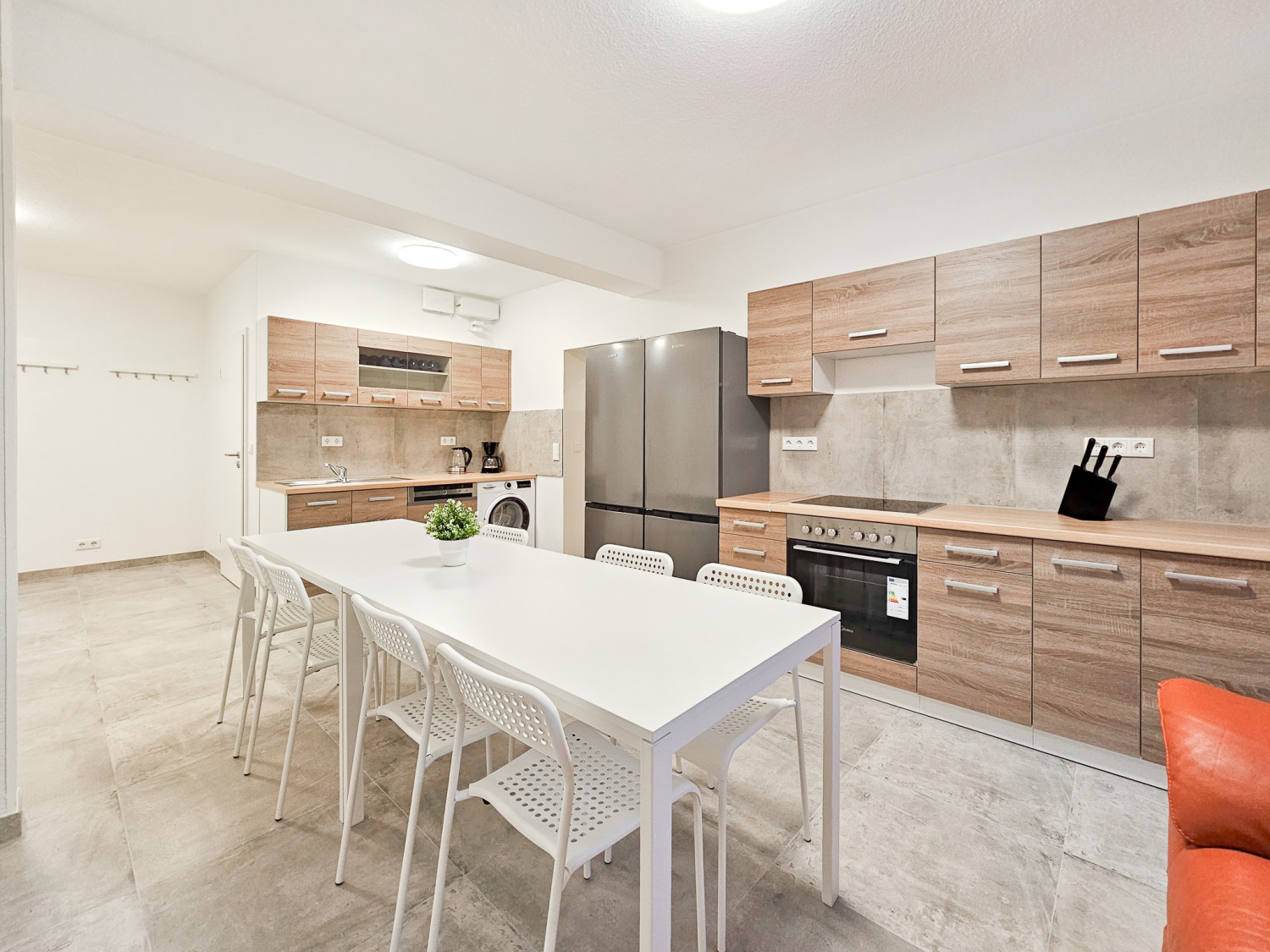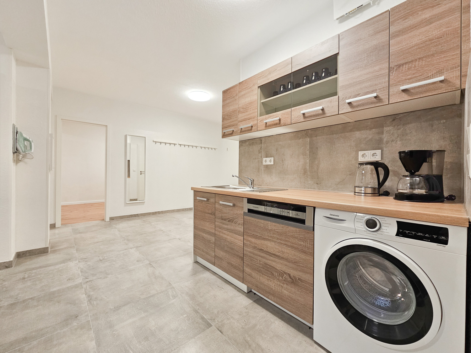 Küche: Kühl-Gefrierkombinationen , Spülmaschine , Backofen , Mikrowelle , Kaffeemaschine , Wasserkocher , Töpfe , Pfannen , Messerset , Geschirr , Gläser , Tassen , Besteck , diverse Kochutensilien , Backpapier , Gewürze , Kaffee , Kaffeefilter , Öl , Zucker und Süßstoff