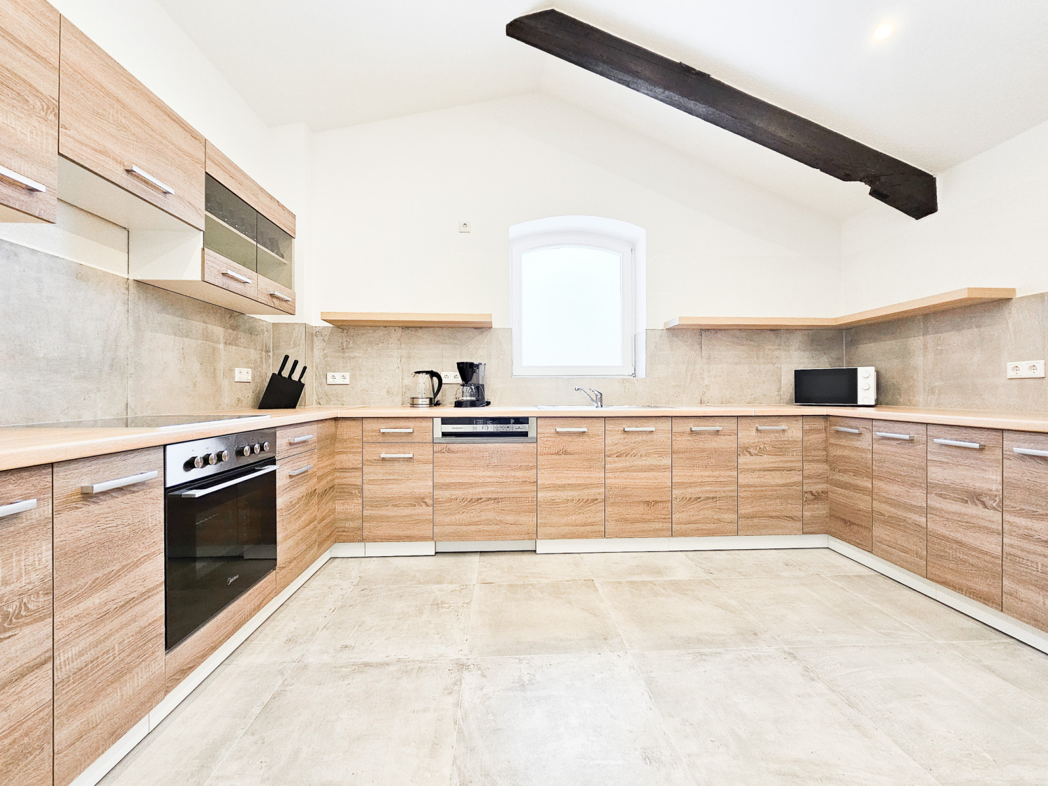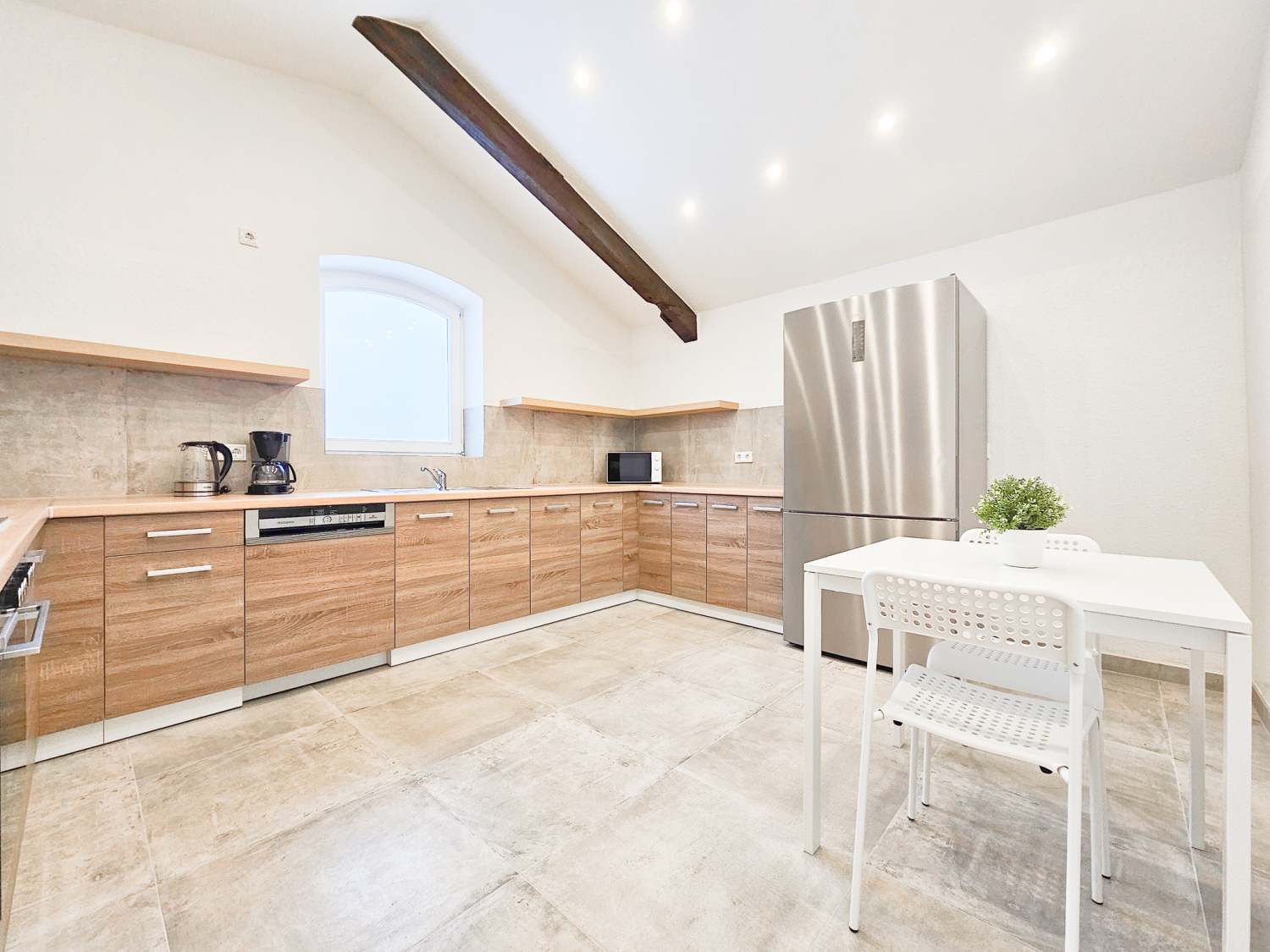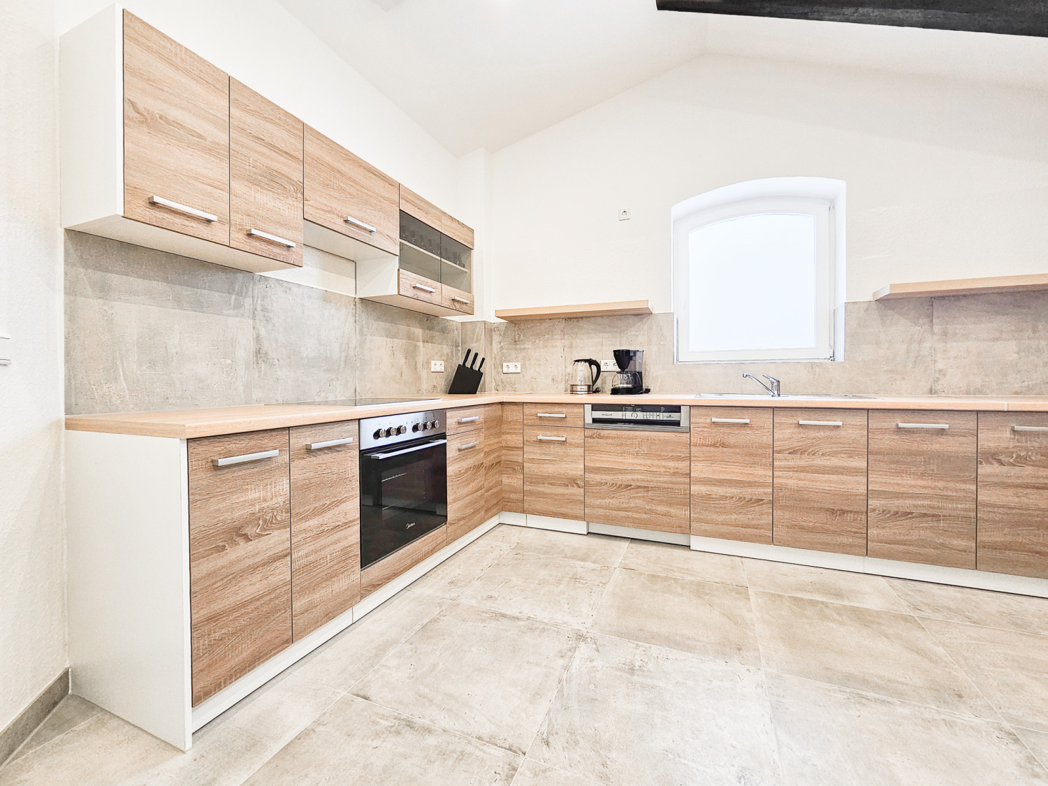 Küche: Kühl-Gefrierkombinationen , Spülmaschine , Backofen , Mikrowelle , Kaffeemaschine , Wasserkocher , Töpfe , Pfannen , Messerset , Geschirr , Gläser , Tassen , Besteck , diverse Kochutensilien , Backpapier , Gewürze , Kaffee , Kaffeefilter , Öl , Zucker und Süßstoff